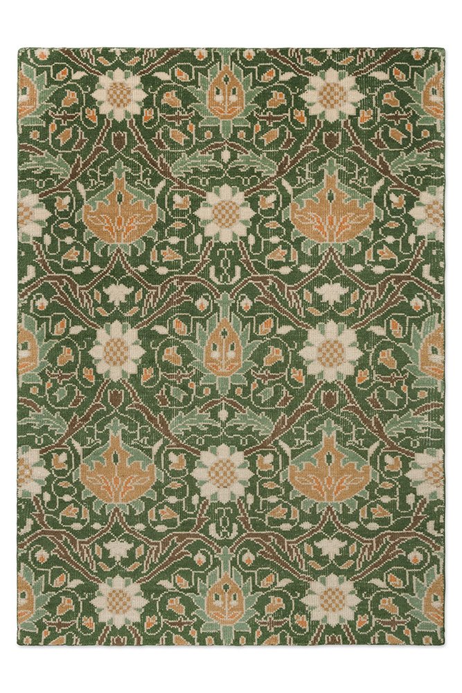 Depicting Persian flowers, this richly floral yet geometric design by John Henry Dearle was originally created in the 1890s for carpet. Here, it is beautifully reimagined as a hand-knotted rug. Crafted in India from 100% pure new wool in forest tones with subtle beige and white highlights, this rug has a 7 mm pile for crisp pattern clarity.